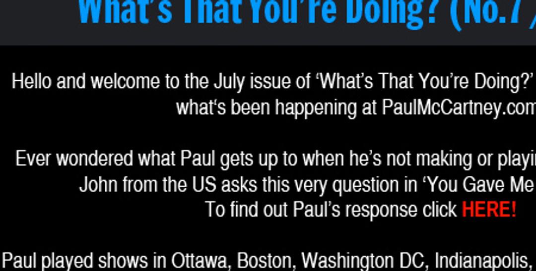 PaulMcCartney.com's monthly newsletter for July - 'What's That You're Doing?' - has been published today. The newsletter collects together the stories from the past month here at the website.