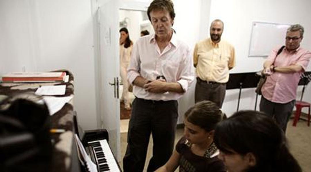 International music icon Paul McCartney today made a surprise, low profile, non-political and unplanned visit to The Edward Said National Conservatory Of Music, a music school for children in Bethlehem. McCartney made the visit ahead of his first ever concert in Israel (Friendship First concert), which takes place tomorrow night in Tel Aviv. Paul met with the surprised and delighted students between the ages of 5 and 14 as they went about what they thought would be just another day. Students couldn't quite believe what was happening as Paul happily chatted and joined in rehearsals with them as he was given a guided tour of the music school.